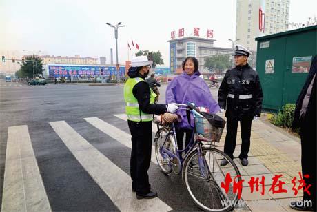 圖四:10 月15 日,交警在七一路與利民街十字路口引導(dǎo)行人過馬路