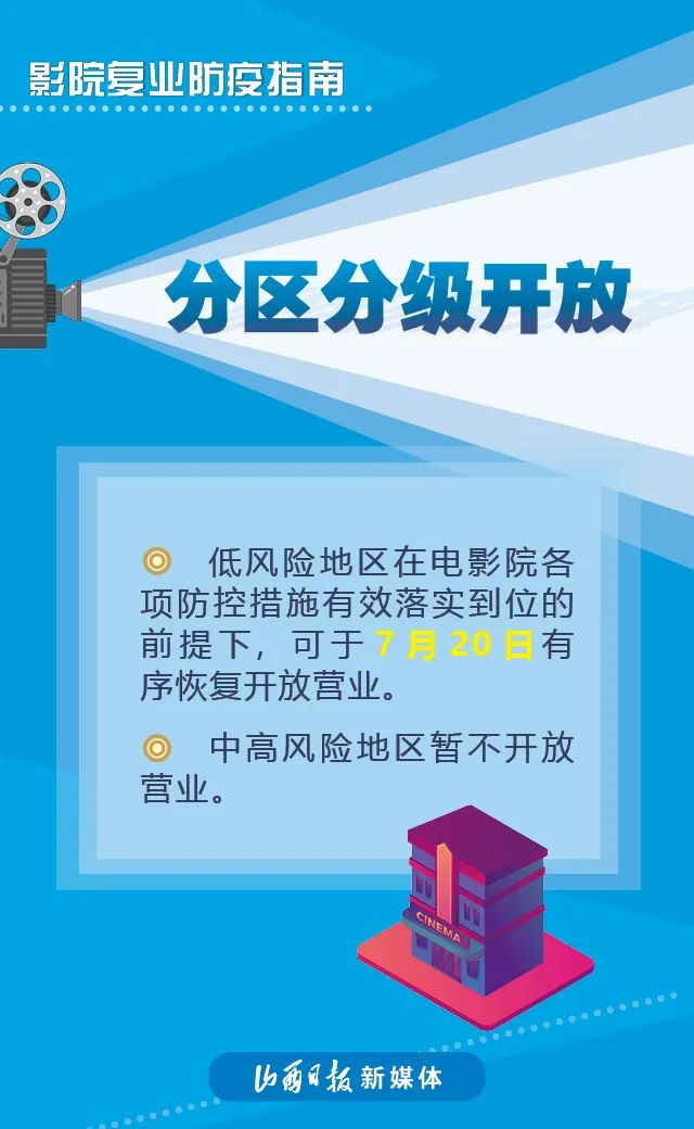 近日,國(guó)家電影局發(fā)布《關(guān)于在疫情防控常態(tài)化條件下有序推進(jìn)電影院恢復(fù)開放的通知》稱,低風(fēng)險(xiǎn)地區(qū)在電影院各項(xiàng)防控措施有效落實(shí)到位的前提下,可于7月20日有序恢復(fù)開放營(yíng)業(yè)。具體要求如下↓↓↓