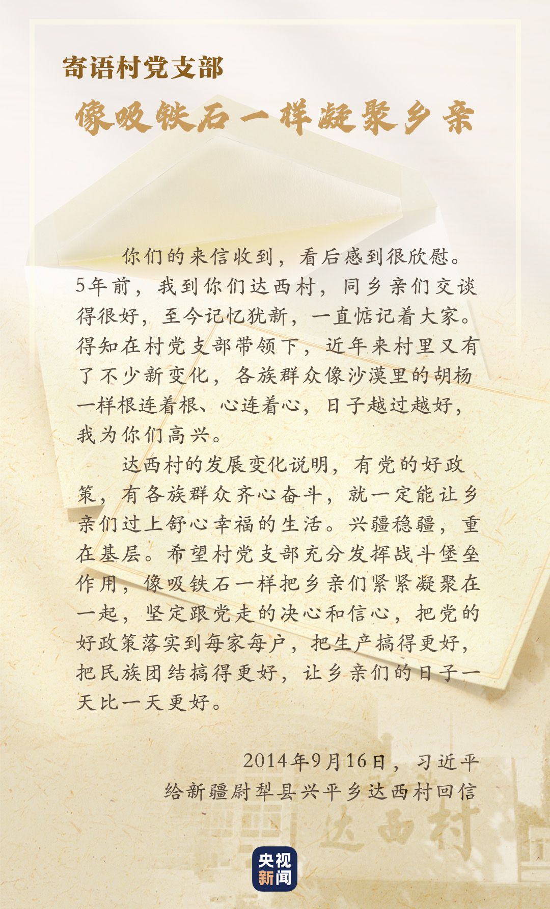 “口袋里要鼓囊囊,精神上要亮堂堂”。2014年4月,習(xí)近平在新疆考察時講到了達西村的村訓(xùn)。村民們懷著激動的心情給總書記寫信,匯報這些年村里的積極變化。當(dāng)年9月,習(xí)近平總書記給沙吾爾·芒力克和全體村民回信,強調(diào)興疆穩(wěn)疆,重在基層。