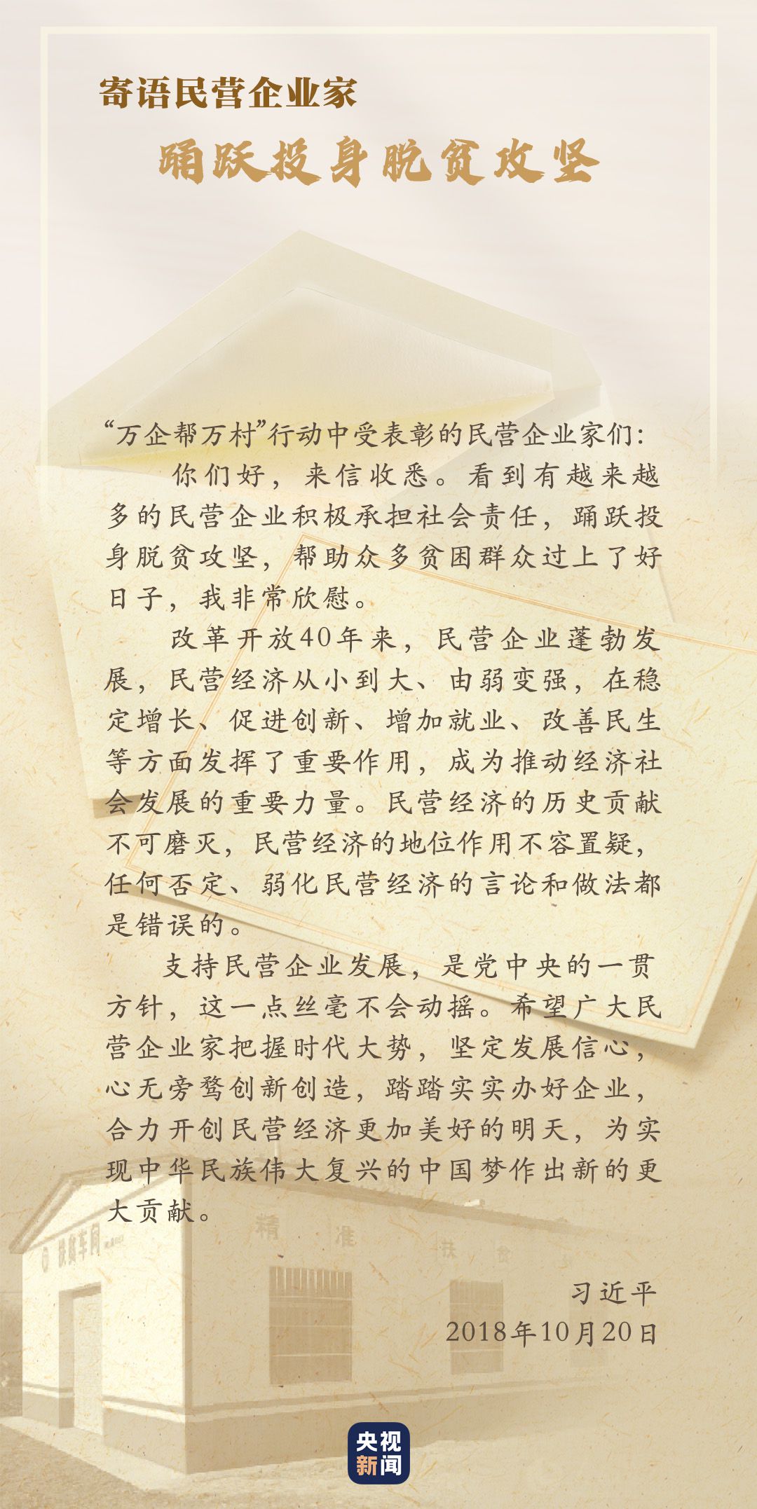 習(xí)近平對民營企業(yè)高度重視,給“萬企幫萬村”行動中受表彰的民營企業(yè)家回信,對他們踴躍投身脫貧攻堅予以肯定,勉勵廣大民營企業(yè)家堅定發(fā)展信心,踏踏實實辦好企業(yè)。
