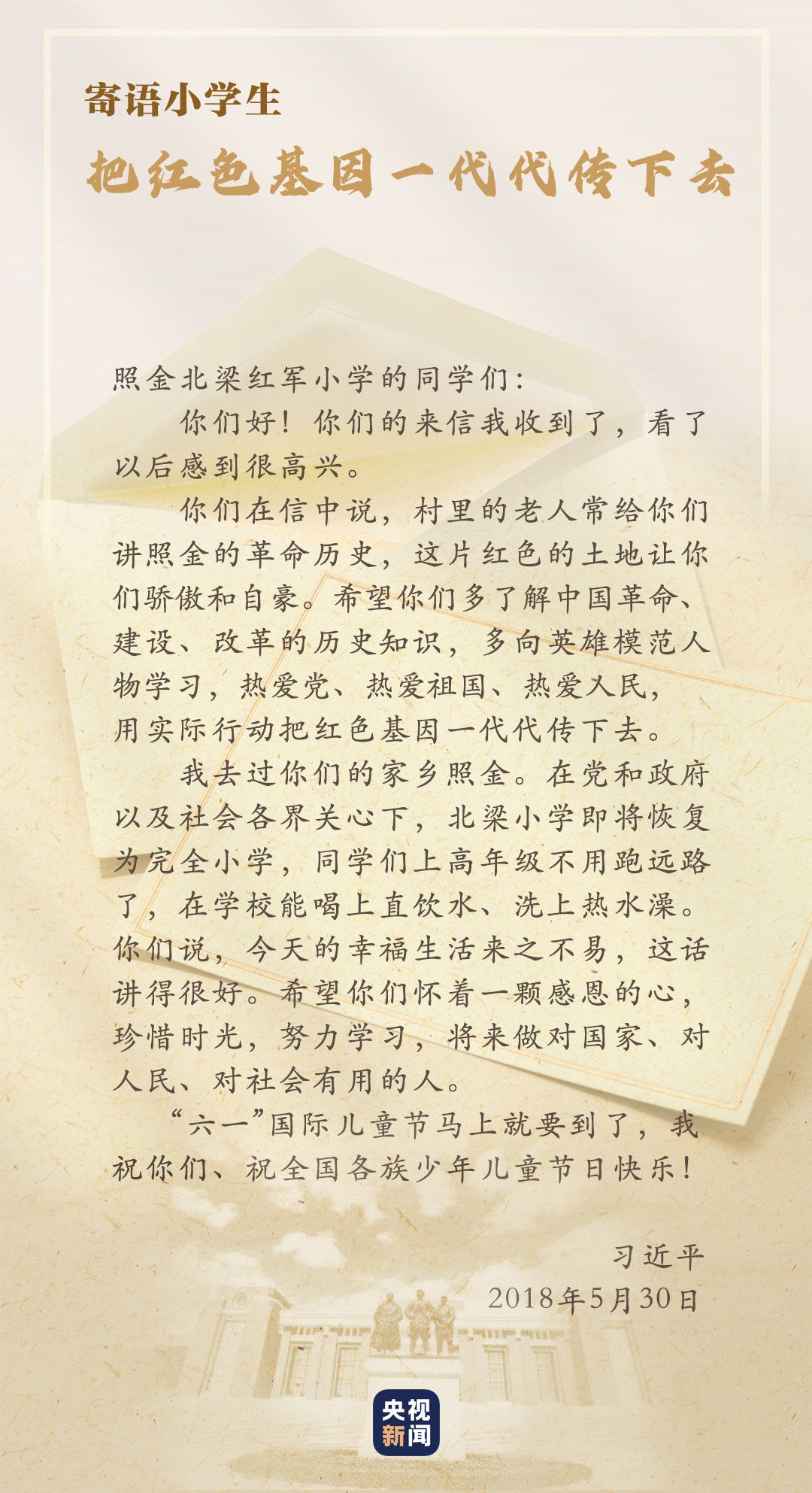 校舍變新了,師資變強了,不變的是代代相傳的紅色基因。總書記的回信,激勵著這里的孩子傳承紅色基因,回報社會,用光熱溫暖更多人,把愛傳遞出去。