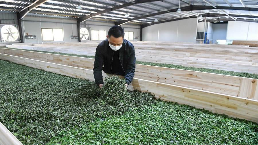 △下黨鄉(xiāng)村民在茶葉生產(chǎn)車間內(nèi)進行壽寧白茶的曬青。