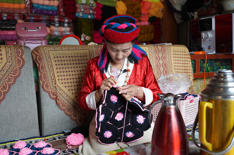 卓瑪正在家里用毛線編織著一對玫瑰花花色的抱枕套,這一對能賣400元。