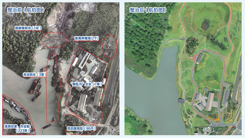薛家洼生態(tài)園地處長江東岸,占地986畝,曾經(jīng)生態(tài)環(huán)境問題非常突出,原有非法碼頭3家,散亂污企業(yè)7家,固廢堆場1處,規(guī)?;笄蒺B(yǎng)殖場2個,危舊民居96戶,??繚O民作業(yè)船、住家船223條?!扒缣煲簧砘?,雨天一身泥”,這是曾經(jīng)薛家洼的真實寫照。