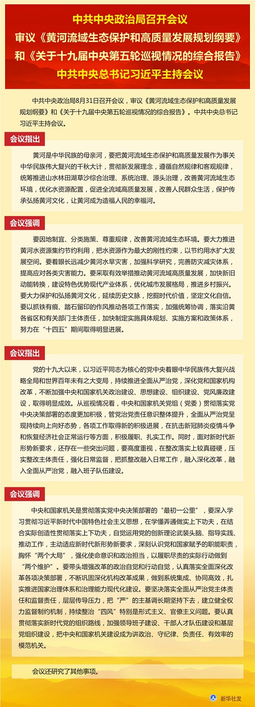新華社北京8月31日電 中共中央政治局8月31日召開(kāi)會(huì)議,審議《黃河流域生態(tài)保護(hù)和高質(zhì)量發(fā)展規(guī)劃綱要》和《關(guān)于十九屆中央第五輪巡視情況的綜合報(bào)告》。中共中央總書(shū)記習(xí)近平主持會(huì)議。