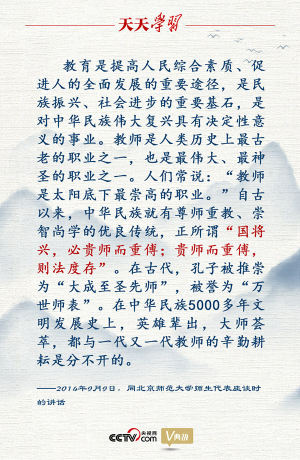 黨的十八大以來(lái),以習(xí)近平同志為核心的黨中央高度重視教育工作,堅(jiān)持把優(yōu)先發(fā)展教育事業(yè)作為推動(dòng)黨和國(guó)家各項(xiàng)事業(yè)發(fā)展的重要先手棋。2014年9月9日,習(xí)近平總書(shū)記在同北京師范大學(xué)師生代表座談講話中,引用荀子的“國(guó)將興,必貴師而重傅;貴師而重傅,則法度存”,強(qiáng)調(diào)教育對(duì)國(guó)家繁榮、民族振興的重要意義。