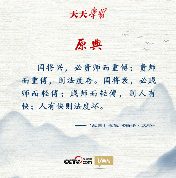 《荀子·大略》更是把教師地位提高到攸關(guān)國(guó)家興亡的高度:“國(guó)將興,必貴師而重傅;貴師而重傅,則法度存?!币馑际牵瑖?guó)家將要興盛,一定尊敬老師并看重有技能的人;如此,規(guī)矩和制度就能保持并得以推行。反之,國(guó)家將要衰微,一定鄙視老師并看輕有技能的人,如此人們就產(chǎn)生放肆之心;人有了放肆之心,規(guī)矩和制度就會(huì)被破壞。這一觀點(diǎn)在中國(guó)思想史上產(chǎn)生了十分深遠(yuǎn)的影響。
