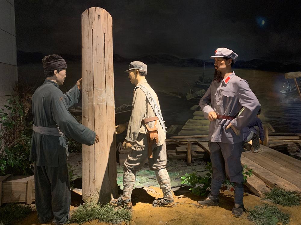 △中央紅軍出發(fā)紀念館再現于都老人將自己的棺木捐給紅軍搭浮橋的場景。(總臺央視記者郭晗光拍攝)