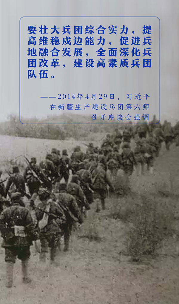 一代代各族兒女發(fā)揚(yáng)胡楊精神、兵團(tuán)精神,無畏艱險(xiǎn)、勇往直前、甘于奉獻(xiàn),奮力為建設(shè)一個(gè)團(tuán)結(jié)和諧、繁榮富裕、文明進(jìn)步、安居樂業(yè)的中國(guó)特色社會(huì)主義新疆作出貢獻(xiàn)。
