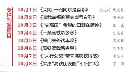 與中國同行 與夢想同行 曾經(jīng),坐火車是一個年輕人的夢想,筆直的軌道通向未知而新奇的世界,讓人心潮澎湃。 幾十年來,承載年輕人夢想的火車,也承載了一個國家的夢想。比如高鐵,它賦予了中國前所未有的速度與激情;比如綠皮火車,它讓中國人看到了晃晃悠悠的人間,雕刻緩慢的時光和鄉(xiāng)愁。 火車上的山西,也是如此,正與中國同行。大張高鐵、大西高鐵、石太客專、太興鐵路……山西鐵路日新月異的背后,是山西高速發(fā)展的縮影。一條條鐵路就像一根根銀線,串起了山西版圖上的一顆顆“珍珠”。 高鐵速度跑出了便捷和美好,并京“同城”夢想成真,成為“速度改變生活”的樣本,京晉經(jīng)濟文化交流更加密切;“蔡家崖號”穿行呂梁山間,為沿線貧困地區(qū)提供著源源不斷的脫貧助力,帶來看得見的變化、穩(wěn)得住的幸福。今年國慶期間,本報開設《坐著火車看山西》專欄,記者踏上火車,體驗生活,假期8天刊發(fā)8篇稿件,展示“十三五”期間我省經(jīng)濟社會發(fā)展的巨大變化。 鐵路與山西緊密相連。近年來,按照國鐵集團統(tǒng)一部署,圍繞“三個世界領先,三個進一步提升”奮斗目標,中國鐵路太原局集團公司加快推進路網(wǎng)建設,大張高鐵開通運營,大西高鐵動車組列車全線貫通,太焦高鐵建設有序推進,確保年底順利開通。山西路網(wǎng)結構不斷完善,為山西構建現(xiàn)代化交通體系,實現(xiàn)高質量轉型發(fā)展提供有力的運輸支撐。太原局集團公司持續(xù)深化“客運提質三年計劃”和“山西全域旅游鐵路行”,深度融入山西文旅發(fā)展戰(zhàn)略,重點圍繞“黃河、長城、太行”三大旅游板塊,推出“坐火車游山西”10條主題旅游精品線路,形成“鐵路+旅游”的發(fā)展模式,助力山西建設國家全域旅游示范區(qū)。 大美山西,絢麗多彩;奮進山西,步履鏗鏘?!安碳已绿枴薄疤泄弧遍_進大山,4對公益性“慢火車”往返穿梭,適時開行惠農(nóng)助學務工專列,因地制宜精準開發(fā)旅游扶貧產(chǎn)品,鐵路帶給貧困群眾看得見的收獲、穩(wěn)得住的幸福。讓我們一起感受三晉巨變,聆聽山西鐵路故事。 大張高鐵:這是山西北部地區(qū)溝通全國的開放大通道,講述了新線推動區(qū)域經(jīng)濟社會發(fā)展的“助力故事”。 太興鐵路:革命老區(qū)連入了全國高速發(fā)展的鐵路客運網(wǎng)絡,講述“蔡家崖號”帶動老區(qū)脫貧的“攻堅故事”。 大西高鐵:線路沿途熱門旅游景點多,文旅深入融合,講述了高鐵帶動沿線文旅發(fā)展的“幸福故事”和中國國家鐵路集團公司推進鐵路建設,不斷完善路網(wǎng)格局的“發(fā)展故事”。 石太客專(太原—陽泉段):有效促進太原、陽泉等沿線地區(qū)與周邊地區(qū)人流、物流、信息流、資金流的快速流動,講述了線路開通使山西進入高鐵時代的“服務故事”。 太焦鐵路:“慢火車”在脫貧攻堅、發(fā)展旅游中也有獨特作用,講述了8171/2次“太行公交”扶貧的“暖心故事”和太焦高鐵“正在建設的故事”。 山西,一路北上是大同;大同,一路向東是首都。坐著火車,乘著高鐵,山西與中國同行、與夢想同行! 大張高鐵 線路 大張高鐵西起山西大同,途經(jīng)陽高、天鎮(zhèn)到河北張家口,是國家“十三五”規(guī)劃“八縱八橫”高速鐵路網(wǎng)京蘭通道的重要干線。線路開通后,北京至大同間的列車運行時間可壓縮至2小時左右,大同到張家口1小時左右可到達。 故事 9月28日上午,G2508次列車由大同南準時出發(fā)。4號車廂里,黃花種植大戶楊琪已經(jīng)習慣了這種奔波往返。“今年從8月份開始,一個月要去北京七八回,而且多數(shù)是上午去、晚上回,都習慣坐高鐵了,還是方便?!彼嬖V記者,他是云州區(qū)的有機黃花種植大戶,也是黃花種植合作社的負責人,現(xiàn)在北京的幾個大超市都有他的黃花產(chǎn)品?!拔疫@次去,就是看看節(jié)慶期間顧客對我們有機黃花的需求?!?/p> 太興鐵路 線路 2018年6月21日,興縣—太原“蔡家崖號”客運列車正式通車,共經(jīng)蔡家崖、白文東、嵐縣等10個車站,使呂梁又增加了一條對外開放的大通道。 故事 9月28日上午,從太原出發(fā)的4621次列車,猶如一條長龍穿行在呂梁山間,過了婁煩站,天空中飄起了小雨,車窗外霧蒙蒙的呂梁山變得更加夢幻。5號車廂3排乘客劉旺林,正在教坐在對面的4歲兒子背詩詞?!芭銗廴巳ケ本z查身體,已經(jīng)出來9天了。這不,趕著回去陪老人過中秋節(jié)。”劉旺林的聲音略顯低沉,但說起蔡家崖號列車帶來的便利,便顯得有些興奮,“我們老區(qū)人民出行真正感覺到了什么叫風雨無阻?!薄俺俗碳已绿柫熊囎穼ぜt色記憶、品嘗土特產(chǎn)品、欣賞田園風光,現(xiàn)在成了城市人的生活新時尚?!绷熊噯T張軍微笑著說。 大西高鐵(南段) 線路 2014年7月1日,大西高鐵(太原南至西安北)暨太原南站正式開通運營,三晉大地從此全面步入高鐵新時代。大西高鐵于2010年3月開工建設,是我國中長期鐵路規(guī)劃網(wǎng)的重要組成部分。 故事 縮短的是時間,拉近的是距離。大西高鐵開通運營后,太原到西安間的時空距離由原來的10小時左右壓縮至3小時左右。在西安交通大學讀研的太原學子小李,多年來往返兩地,他說:“以前只有放假才能回家,有了高鐵后,周六早上坐車,中午就能到家吃上父親做的飯,周日下午再回校,感覺家的距離