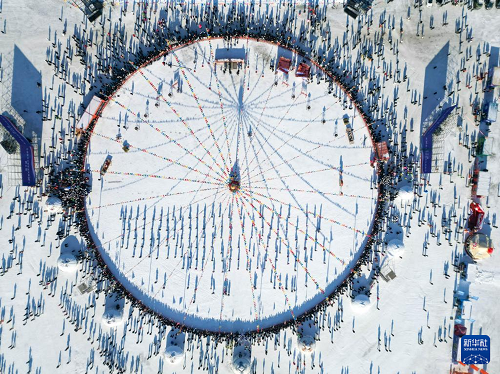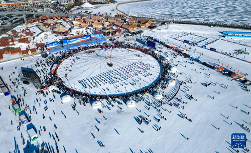 1月8日,在吉林省松原市,人們參加吉林·查干湖第24屆冰雪漁獵文化旅游節(jié)開幕式(無人機(jī)照片)。(新華社記者 顏麟蘊 攝)