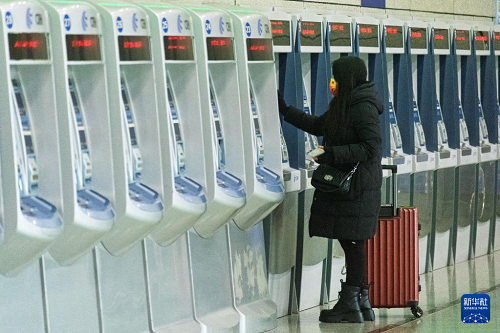 1月19日,旅客在江蘇揚州東站售票廳內(nèi)的自動售票機前購買車票。(新華社發(fā) 孟德龍 攝)