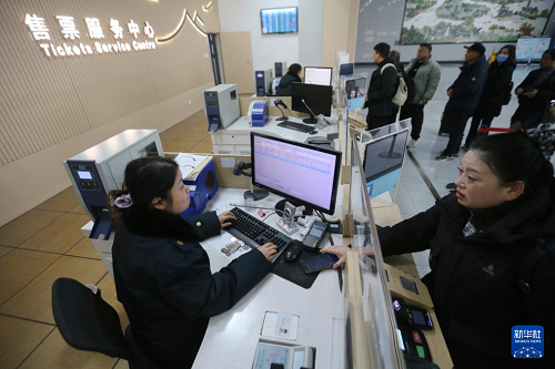1月19日,南京南站工作人員在售票處為旅客辦理車票業(yè)務(wù)。(新華社發(fā) 蘇陽 攝)