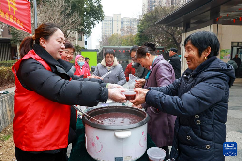 1月25日,江蘇省泰興市濟(jì)川街道張陳社區(qū)泰和苑小區(qū)內(nèi),志愿者給居民盛臘八粥。(新華社發(fā) 顧繼紅 攝)