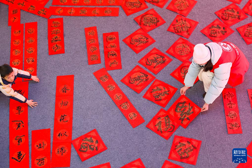2月8日,學(xué)生志愿者(右)在江蘇省海安市政協(xié)書畫聯(lián)誼會(huì)送福字、贈(zèng)春聯(lián)文化惠民活動(dòng)現(xiàn)場(chǎng)整理書法作品。(新華社發(fā) 顧彬斌 攝)