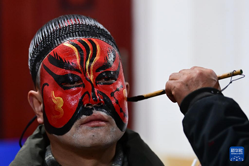3月2日凌晨,老藝人為隴縣黃花峪村社火隊隊員繪制社火臉譜。(新華社記者 鄒競一 攝)