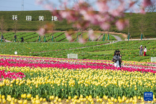 花田美地景區(qū)是浙江省金華市武義縣王宅鎮(zhèn)的特色鄉(xiāng)村旅游項(xiàng)目。近日,景區(qū)花海進(jìn)入盛花期,金黃色的油菜花與粉色櫻花、多彩郁金香等共同構(gòu)成春日美麗畫卷,吸引游客前來打卡游玩。