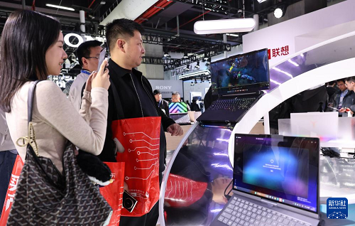 3月12日,參觀者在東方樞紐展區(qū)現(xiàn)場(chǎng)一款屏幕可伸縮的筆記本電腦產(chǎn)品前駐足觀看。(新華社記者 方喆 攝)