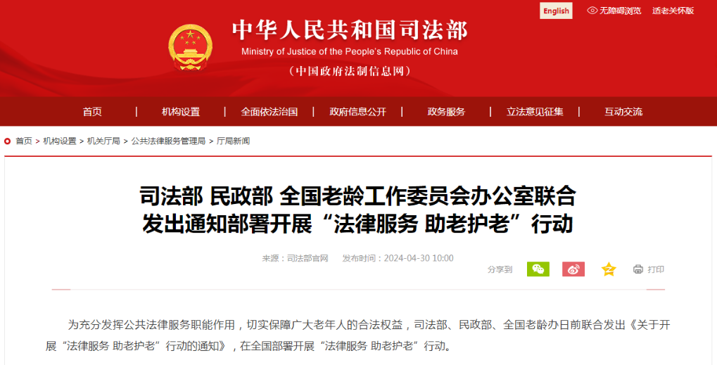 司法部、民政部、全國(guó)老齡辦日前聯(lián)合發(fā)出《關(guān)于開(kāi)展“法律服務(wù) 助老護(hù)老”行動(dòng)的通知》,在全國(guó)部署開(kāi)展“法律服務(wù) 助老護(hù)老”行動(dòng)。行動(dòng)聚焦老年人群體公共法律服務(wù)需求,推出6個(gè)方面措施。