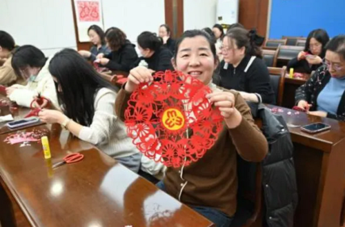此次活動特邀五臺非遺剪紙傳承人王森煒現(xiàn)場教學(xué),從折疊技巧到紋樣設(shè)計(jì),從鏤空雕刻到細(xì)節(jié)精修,干警們在老師的指導(dǎo)下沉浸式感受剪紙藝術(shù)的魅力。紅紙翻飛間,一幅幅寓意幸福吉祥、展現(xiàn)女性力量的剪紙作品逐漸成型。指尖流淌的不僅是傳統(tǒng)技藝,更是檢察女性剛?cè)岵?jì)、匠心獨(dú)運(yùn)的精神底色。