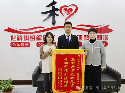 “感謝調(diào)解員為我們排憂解難,提供高效便捷的司法服務(wù),本來以為訴訟時(shí)間會(huì)很長(zhǎng),沒想到這么快就處理好了,今后我們一定努力提高服務(wù)水平?!苯眨澄飿I(yè)公司將一面寫有“高效辦案盡職盡責(zé) 專業(yè)嚴(yán)謹(jǐn)司法楷?!钡腻\旗送至河曲法院訴前調(diào)解中心,對(duì)法院溫馨的訴訟服務(wù)和特邀調(diào)解員優(yōu)質(zhì)高效的調(diào)解表示感謝!