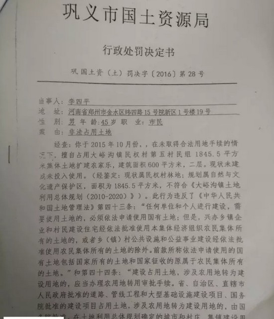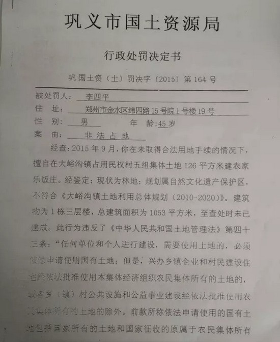 據(jù)記者獲取的材料顯示,2015年12月份,鞏義市國土資源局對李四平進行處罰,案由為“非法占地”。李四平擅自占用集體土地126平方米,建設(shè)農(nóng)家樂,土地性質(zhì)為林地。對其處罰為“自行拆除在非法占用的126平方米土地上新建的建筑物和其他設(shè)施,恢復(fù)土地原狀”“對非法占用的126平方米土地,按每平方米3元處以罰款,共378元。”
