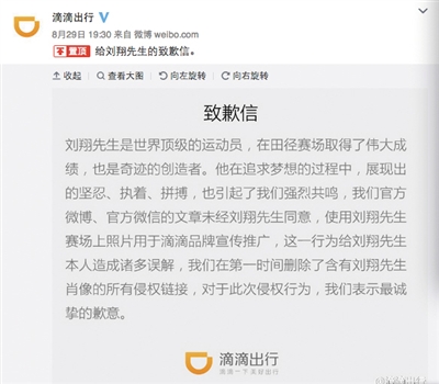 29日晚間,滴滴出行在其官方微博中發(fā)布了“給劉翔先生的致歉信”,承認(rèn)未經(jīng)同意使用劉翔相關(guān)照片用于推廣,已造成侵權(quán)。新京報(bào)記者了解到,另一家涉及侵權(quán)的公司極路由也已向劉翔公開致歉。