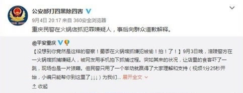 事后,有媒體了解到這名道歉者是來自重慶市涪陵區(qū)公安局荔枝派出所的一名民警。據(jù)他介紹,當(dāng)時(shí)是正在對一名長期吸販毒的犯罪嫌疑人實(shí)施抓捕。由于嫌疑人吸食毒品精神亢奮且隨身攜有刀具,抓捕過程比較激烈,不少店內(nèi)客人都起身圍觀,有些還拿出手機(jī)拍攝。抓捕結(jié)束后,帶隊(duì)民警第一時(shí)間找來餐館老板,亮明身份后表示警方會妥善處理餐館損失,并且特意向店內(nèi)顧客道歉,于是就有了視頻中顯示的畫面。
