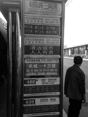 市民關(guān)先生反映,在朝陽區(qū)朝陽路三間房公交站牌上看到一塊“公交旅游長城——十三陵”的牌子,他上網(wǎng)查詢發(fā)現(xiàn)根本沒有此專線。5日上午,北京晨報(bào)記者實(shí)地探訪發(fā)現(xiàn),這塊“公交旅游”的牌子不同于其他線路牌,明顯為新粘貼的,而且是不干膠質(zhì)地。北京旅游集散中心的工作人員提示,在公交車站、地圖等上面粘貼的旅游熱線均為黑專線。下午,該非法廣告已經(jīng)被及時(shí)清除。
