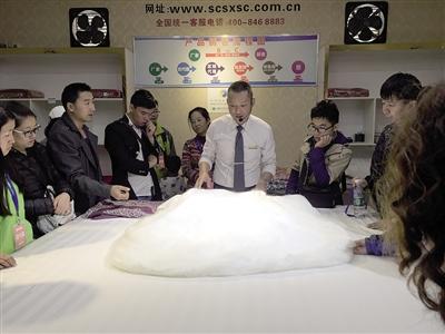 下午2點(diǎn)半,按照行程,旅行團(tuán)將參觀蜀繡,旅行團(tuán)被帶往一家門(mén)口寫(xiě)有“蜀繡蜀錦科技文化展示中心”字樣的單位,但這家單位實(shí)際上是名為“依格爾”的床上用品直銷(xiāo)工廠。講解員簡(jiǎn)單講解了有關(guān)蜀繡蜀錦的知識(shí)后,就把游客帶往一個(gè)展覽廳,向游客推介他們工廠的蠶絲床上用品,價(jià)格從3980到6980元不等。