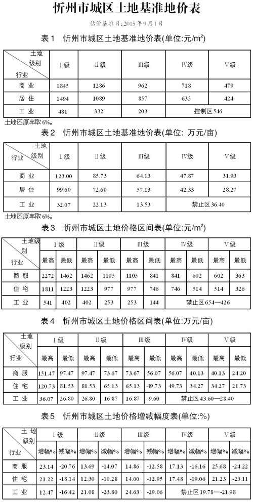 忻州市新一輪城鎮(zhèn)土地面積134.99平方公里基準(zhǔn)地價(jià)更新工作已經(jīng)省國土資源廳組織有關(guān)專家檢查驗(yàn)收。根據(jù)《山西省國土資源廳關(guān)于忻州市城鎮(zhèn)土地定級(jí)估價(jià)更新結(jié)果的批復(fù)》(晉國土資技審〔2015〕118號(hào)),現(xiàn)將忻州市城鎮(zhèn)土地基準(zhǔn)地價(jià)予以公布實(shí)施。