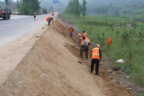 進(jìn)入汛期以來(lái),靜樂公路管理段將路基邊坡加固作為安全隱患治理,保障公路安全暢通的重要養(yǎng)護(hù)工作來(lái)抓,堅(jiān)持不懈的做好強(qiáng)基固路工作。確保了預(yù)防性、預(yù)警性、安全性養(yǎng)護(hù)三到位,圖為養(yǎng)路工正在培土加固邊坡。(李永珍 攝)