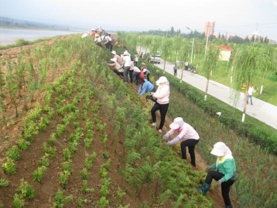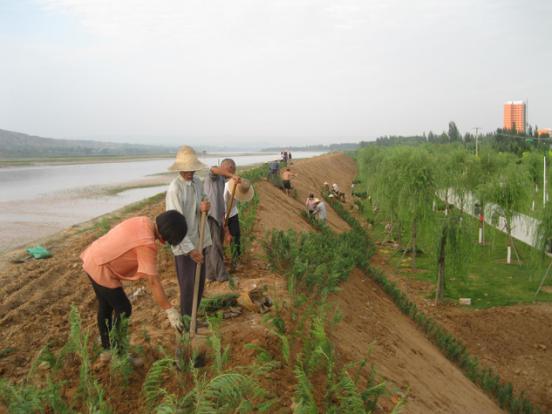 8月24日,河曲縣城北防護堤上植綠場面熱火朝天:數(shù)十名工人在堤上成排栽植爬地柏,坡面栽成菱形邊;菱形內(nèi)外栽植花草“三七景天”;園林綠化車輛跟進澆水。