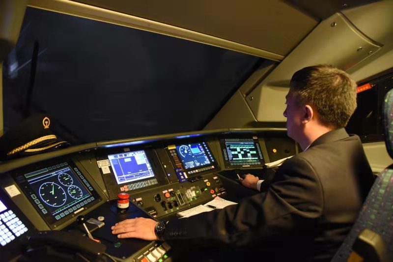 當D6770次列車到達呼和浩特東站,弓國慶登上機車,與換班司機交接完畢后,插入IC卡,認真核對行車數(shù)據(jù)、確認操縱臺各儀表……各項安全準備工作無誤后,隨著機車前方發(fā)車信號變?yōu)榫G燈,與車站進行車機聯(lián)控確認,隨著一聲汽笛長鳴,動車組緩緩駛出呼和浩特東站。“徹底瞭望,確認信號,高聲呼喚,手比眼看”的標準化作業(yè)與每三十秒腳踩提醒踏板的一系列操作流暢默契……盡管這種周而復始的工作他已重復了成千上萬遍,但從不敢松懈。