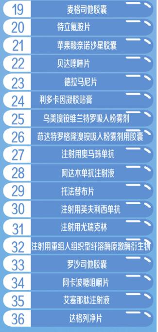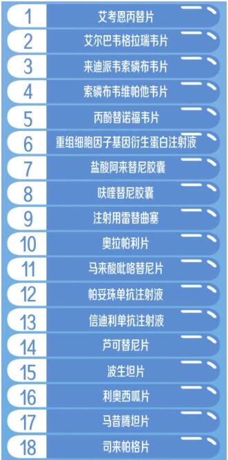 國(guó)家醫(yī)保局醫(yī)藥服務(wù)管理司司長(zhǎng)熊先軍介紹,此次談判成功的藥品多為近年來(lái)新上市且具有較高臨床價(jià)值的藥品,涉及癌癥、罕見(jiàn)病、風(fēng)濕免疫、心腦血管、消化等10余個(gè)臨床治療領(lǐng)域。重點(diǎn)領(lǐng)域的5個(gè)基本藥物全部談判成功,22個(gè)抗癌藥、7個(gè)罕見(jiàn)病用藥、14個(gè)慢性病(含糖尿病、乙肝、風(fēng)濕性關(guān)節(jié)炎等)用藥、4個(gè)兒童用藥談判成功,進(jìn)一步優(yōu)化了目錄結(jié)構(gòu)。