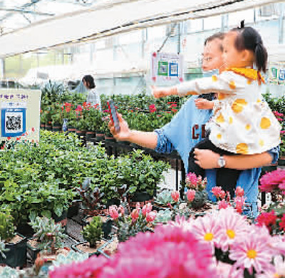 江蘇南通市民在五里樹花卉基地掃碼購(gòu)買鮮花,體驗(yàn)不接觸購(gòu)物帶來(lái)的便捷。王俊榮攝(人民視覺)