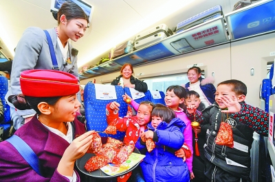 1月24日,在重慶開往福州的G1755次列車上,乘務(wù)員和“小候鳥”做游戲。春運期間,大批務(wù)工人員子女隨長輩踏上與父母團聚的旅途,南鐵福州客運段提前對重點線路乘務(wù)組進行兒童陪護培訓,在列車上準備了書本和玩具,用愛心護航“小候鳥”的團圓路。新華社記者 宋為偉攝