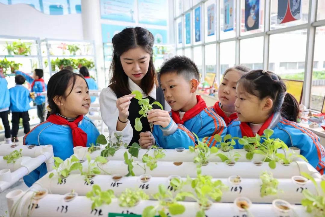 2024年11月21日,在湖北省襄陽市大慶路小學“校園農(nóng)場”,老師正在講解水培植物的相關知識。聶志鵬 付小方 攝