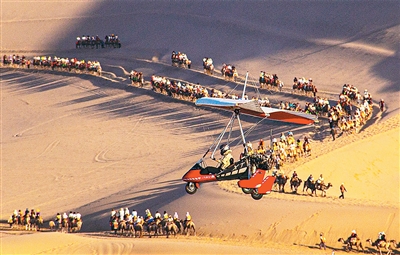 近年來,在甘肅省敦煌市鳴沙山月牙泉景區(qū)運營的敦煌“飛天”通用航空項目,為游客提供低空飛行器旅游服務,讓游客乘坐直升機、動力滑翔機,從空中欣賞大漠綠洲和月牙泉美景,沉浸式體驗敦煌獨特魅力。圖為7月3日,游客乘坐滑翔機空中俯瞰敦煌大漠風光。王斌銀攝(人民視覺)