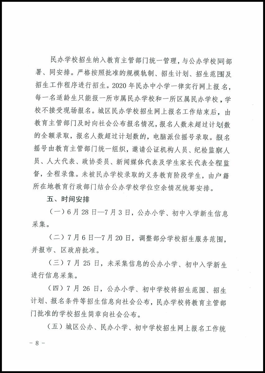 民辦學(xué)校招生納入教育主管部門統(tǒng)一管理與公辦學(xué)校同部署、同安排。嚴(yán)格按照批準(zhǔn)的規(guī)模軌制、招生計(jì)劃、招生范圍及招生工作程序進(jìn)行招生。2020年民辦中小學(xué)一律實(shí)行網(wǎng)上報(bào)名,每一名適齡生只能報(bào)一所市屬民辦學(xué)校和一所區(qū)屬民辦學(xué)校,學(xué)校不接受現(xiàn)場(chǎng)報(bào)名。