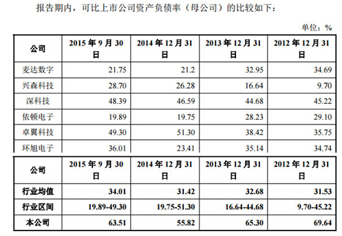 究其原因,一方面,原材料價格正在步入上升通道。2016年以來,工業(yè)價格指數(shù)同比降幅逐漸收窄,主要原材料購進價格指數(shù)大幅上升,從2015年12月的42.4升至2016年3月的55.3。另一方面,招股書指出,電子制造服務(wù)行業(yè)受下游行業(yè)需求變動的影響較大,且未來競爭會加劇,人工成本及物價水平還會不斷提升,可能會導致公司業(yè)務(wù)毛利率低于報告期水平。 同時,公司利潤增速卻在2015年由正增長轉(zhuǎn)為負增長。易德龍只披露了 2015年1-9月份的數(shù)據(jù),若由此估算全年數(shù)據(jù),可以發(fā)現(xiàn)公司的利潤總額同比下降逾24%,而同行業(yè)上市公司營業(yè)利潤卻保持了正增長。 更何況,易德龍主營業(yè)務(wù)的穩(wěn)定性也比較差。作為最大客戶,康普通訊技術(shù)(中國)有限公司在易德龍主營業(yè)務(wù)收入中的銷售占比在40%左右,在通訊類產(chǎn)品中的銷售占比則在80%以上。2013 年、2014年,易德龍對康普通訊的銷售均有大幅增長,但由2015年1-9月份的數(shù)據(jù)估算全年,易德龍對康普通訊的銷售同比下降7.1%。 負債占比偏高 前五大客戶欠款占比過半 招股書顯示,2015年9月末,易德龍資產(chǎn)負債率較2014年上升近8個百分點至63.51%,比招股書所列同行業(yè)上市公司平均資產(chǎn)負債率高出近30個百分點。其中的主要負債是流動負債,截至2015年9月末,流動負債在負債中的占比高達95%,而同行業(yè)已上市公司平均占比為80.41%。