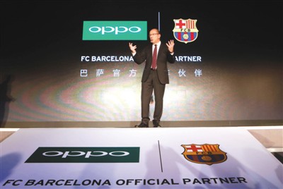 去年9月8日,西甲巴塞羅那俱樂(lè)部與OPPO手機(jī)在北京召開(kāi)聯(lián)合新聞發(fā)布會(huì),宣布自2015-2016賽季開(kāi)始,OPPO正式成為巴塞羅那俱樂(lè)部官方合作伙伴。圖為巴塞羅那俱樂(lè)部副主席佩雷斯在新聞發(fā)布會(huì)上致辭。