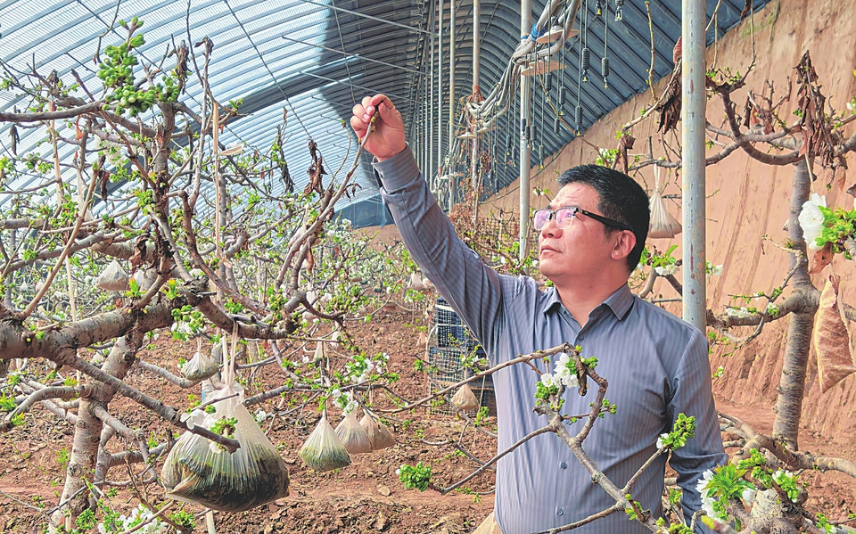 婁淵斌正在檢查車?yán)遄訕?shù)開(kāi)花情況。本報(bào)記者暢雪攝