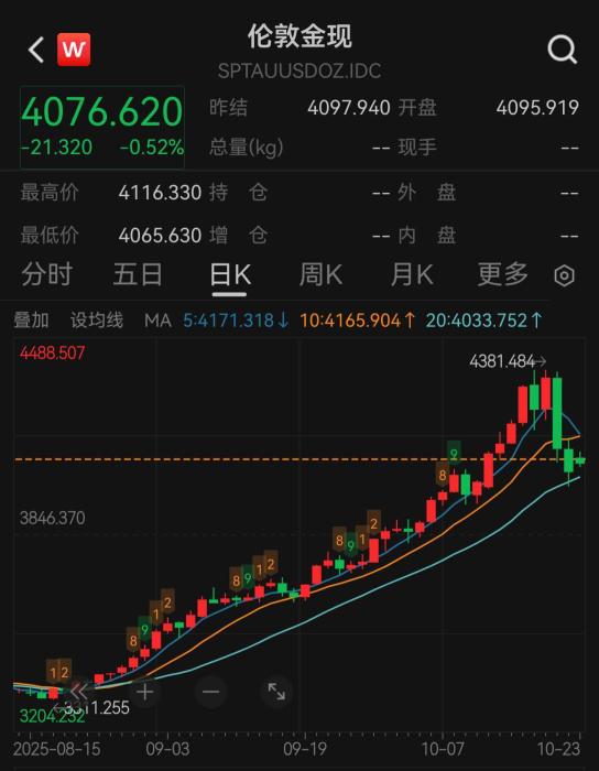 數據來源:Wind 10月22日,倫敦現貨黃金價格盤中逼近每盎司4000美元。23日亞洲早盤時段,倫敦現貨黃金為每盎司4090美元左右。 彭博社稱,技術指標顯示,本輪漲勢可能略顯過度,本周的回調令市場稍顯疲態(tài)。今年以來,金價已上漲約55%,近幾周,市場預期美聯儲將在年底前至少降息四分之一個百分點,同樣支撐了金價。 彭博援引分析師稱,金價仍守在4000美元上方,表明價格出現技術性回調,而非根本性轉變。 不少業(yè)內分析人士認為,資金獲利了結是近期金價滑落的重要原因。 長期投資者、對沖基金Crescat Capital的凱文·史密斯表示,本周的回調是一次健康的回調,并表示推動金價上漲的諸多因素仍然存在。 華爾街日報援引蘇克敦金融(Sucden Financial)研究團隊分析稱,投資者一直在對上周的投機性飆升進行部分平倉。貴金屬價格回落可能反映出投資者獲利了結及避險資金流的減少,而非美國國債收益率的走勢。仍然低迷的美國國債收益率和持續(xù)的宏觀不確定性將繼續(xù)為其價格提供潛在支撐。 (責任編輯:梁艷) |