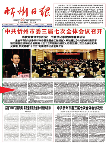 中國共產(chǎn)黨忻州市第三屆委員會第七次全體會議于12月28日在忻州召開。全會聽取討論了《中共忻州市委常委會工作報告》,審議通過了《中共忻州市委關(guān)于制定國民經(jīng)濟(jì)和社會發(fā)展第十三個五年規(guī)劃的建議》,研究部署了“十三五”時期經(jīng)濟(jì)社會發(fā)展工作。