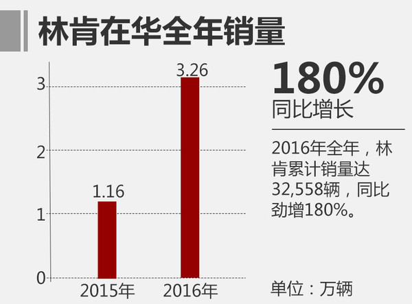 在陸續(xù)引入四款新車后,隨著產(chǎn)品線的逐漸豐富,開始走“親民”路線的林肯在重回中國(guó)市場(chǎng)后銷量大幅攀升。較之2015年的11,630輛,2016年全年林肯累計(jì)銷量達(dá)32,558輛,同比勁增180%,其增速成為中國(guó)成長(zhǎng)最快的豪華品牌。在第四季度,林肯單月銷量達(dá)11,562輛,占全年銷量的35.5%,同比增幅162%。