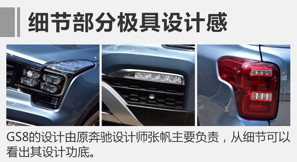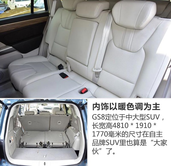 GS8的設計由原奔馳設計師張帆操刀,在內飾部分也較為洞察國內消費者的喜好。車內整體寬敞舒適,顏色采用偏暖的木色,打造一種家用溫馨感。空間方面,GS8的長寬高分別為4810*1910*1770毫米,軸距2800毫米,采用7座布局。