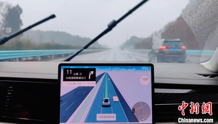 圖為國(guó)內(nèi)首個(gè)“智慧高速+車(chē)機(jī)導(dǎo)航”應(yīng)用在下雨的成宜高速上使用。 蜀道集團(tuán)供圖