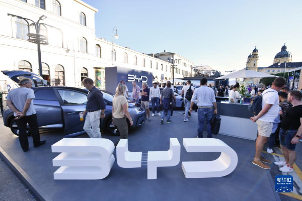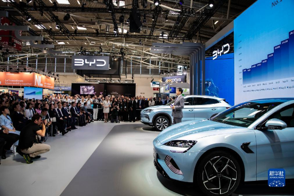 這是9月4日在德國慕尼黑國際車展媒體預(yù)展上拍攝的比亞迪發(fā)布會現(xiàn)場。