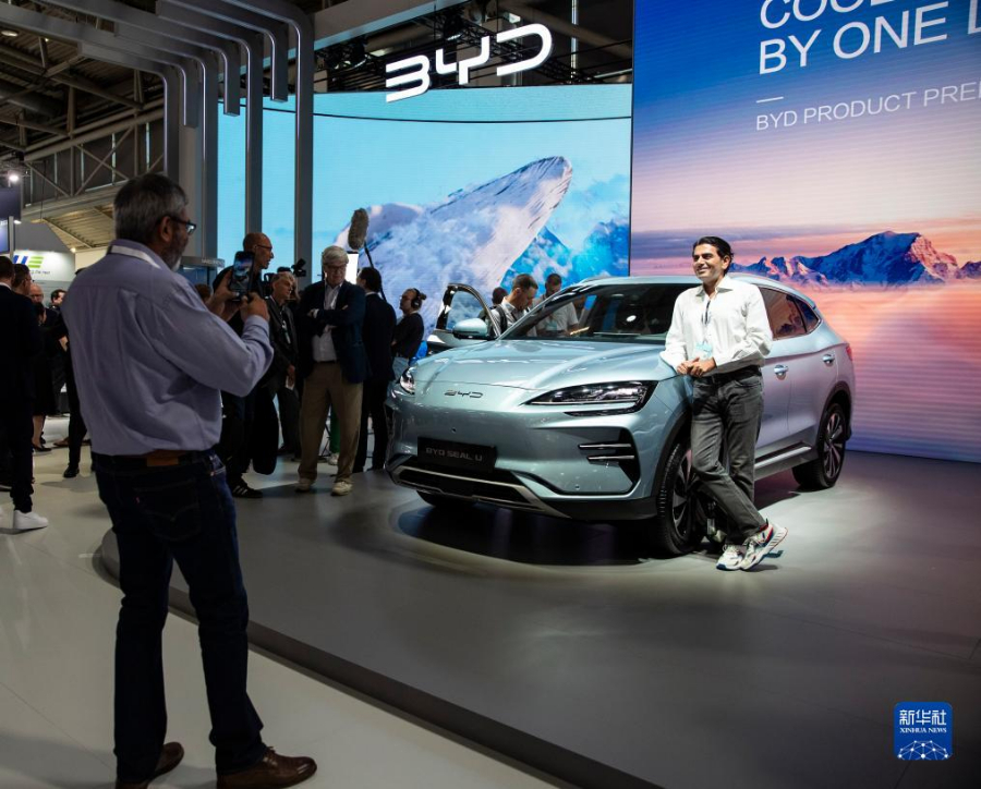 9月4日,在德國慕尼黑國際車展媒體預(yù)展上,參觀者在比亞迪品牌發(fā)布會現(xiàn)場與BYD SEAL U汽車合影。